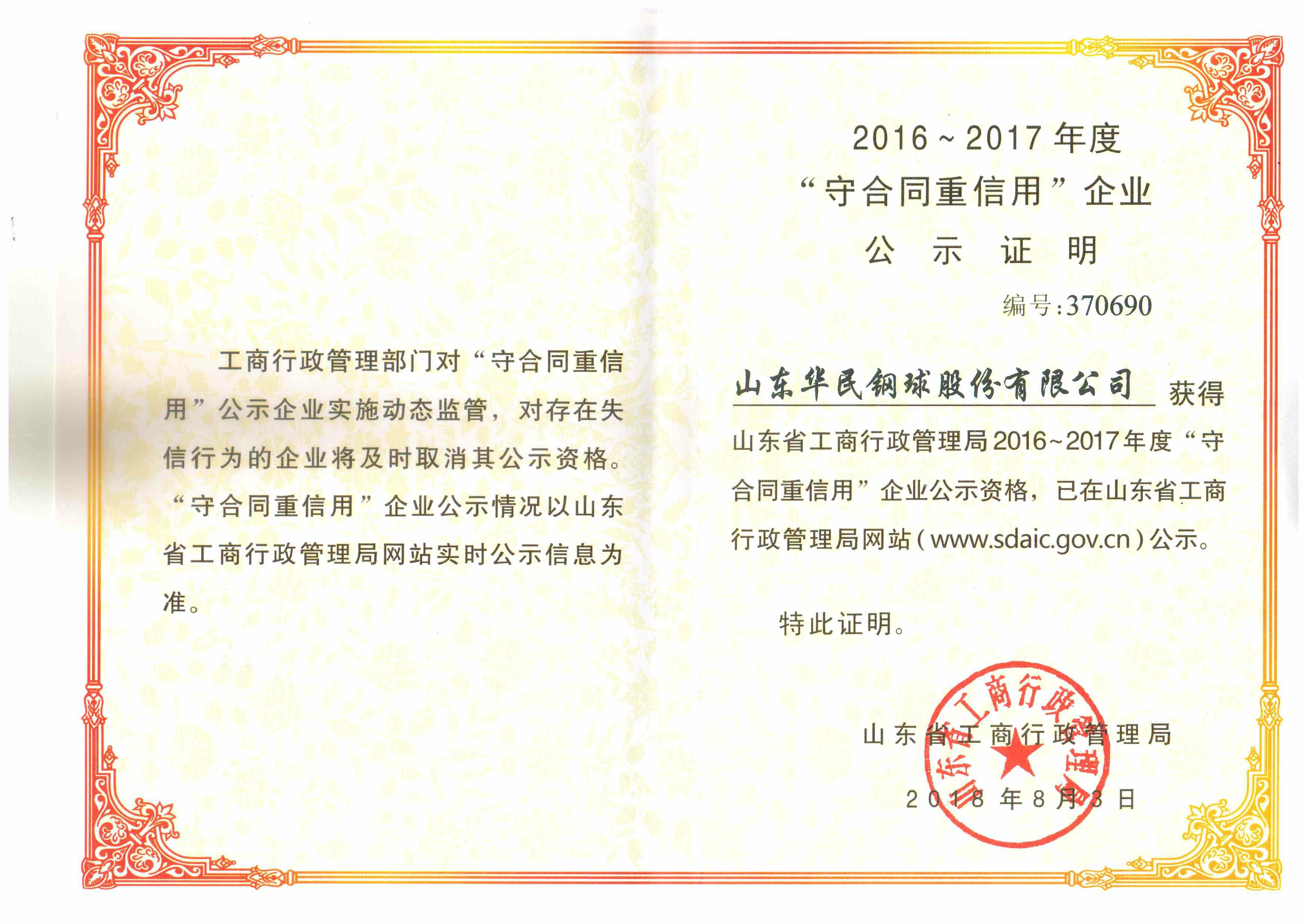 • 山東省守合同重信用證書(shū)