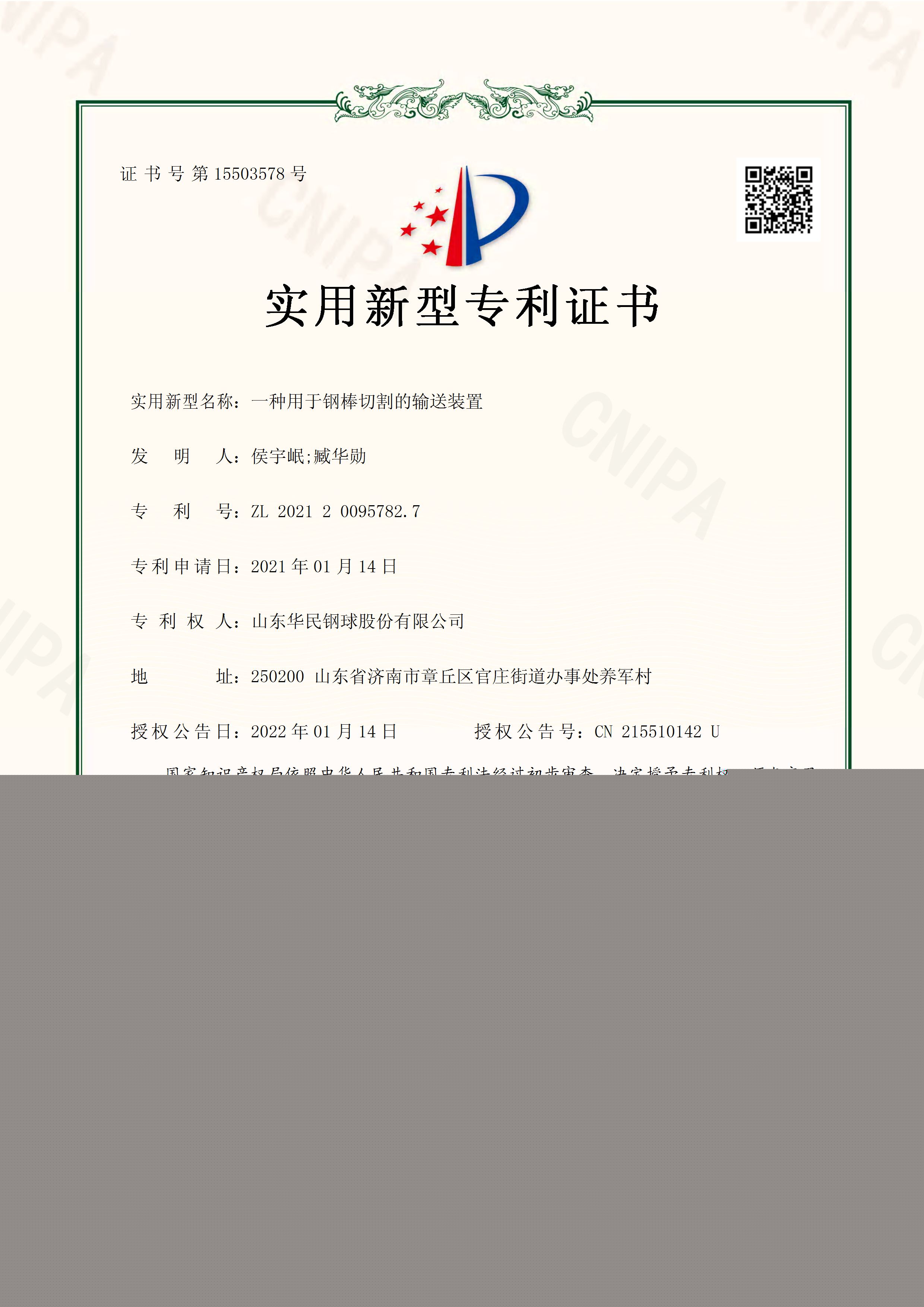 • 一種用于鋼棒切割的輸送裝置實(shí)用新型專利證書(shū)
