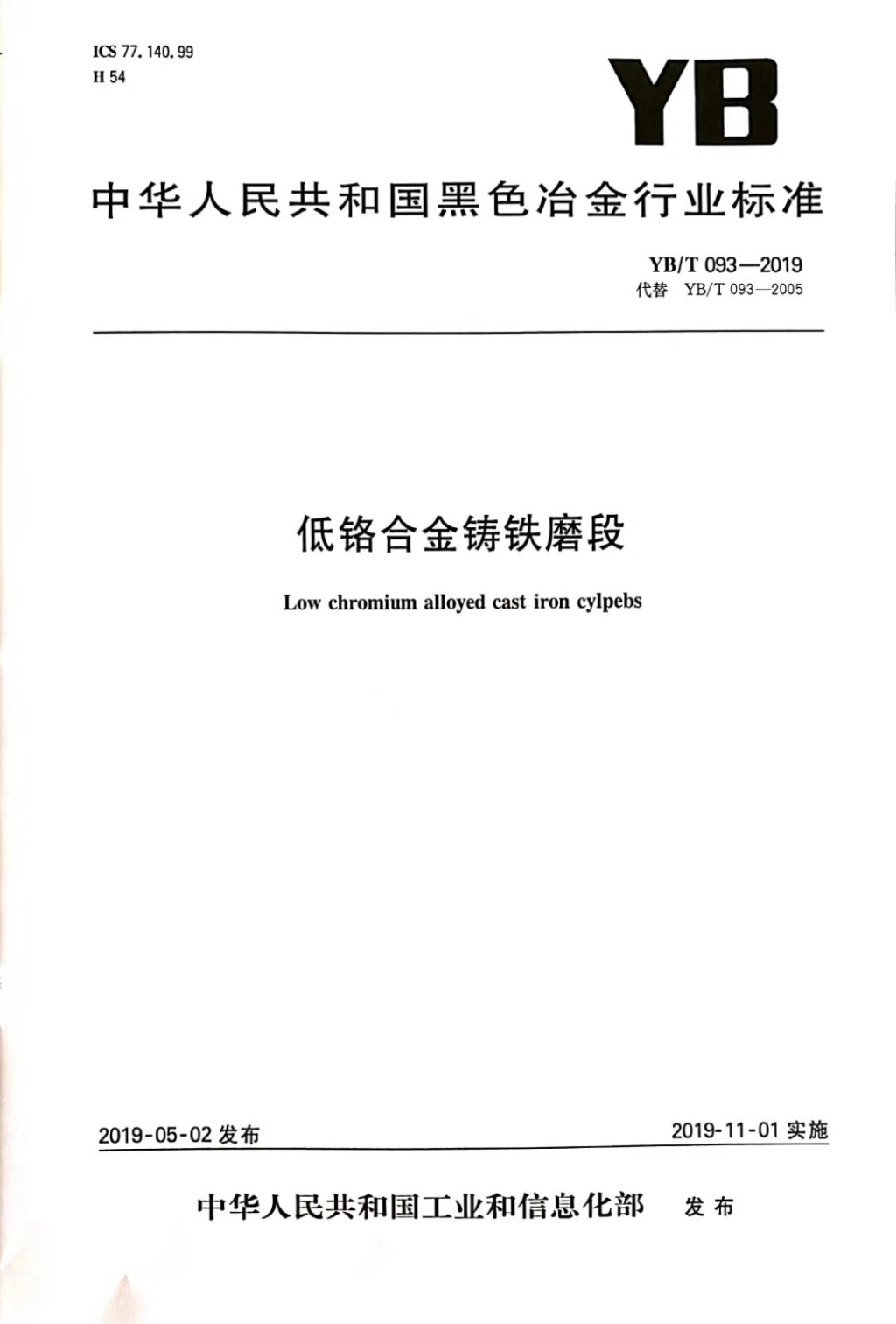 • 低鉻合金鑄鐵磨段YB/T 093-2019