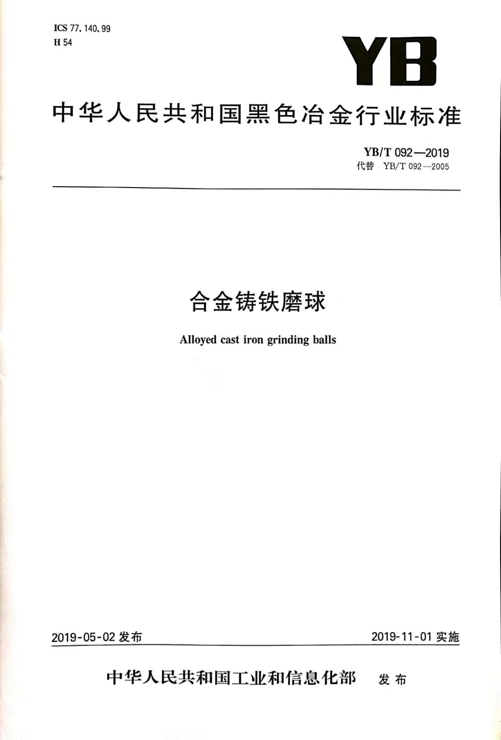 • 合金鑄鐵磨球YB/T 092-2019